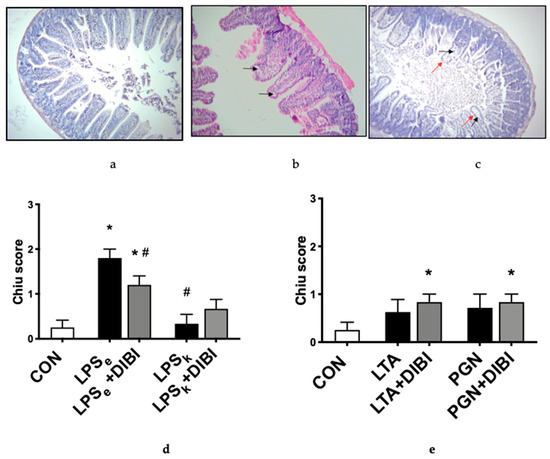 Chiu score [22] of a murine intestinal cross-section showing different degrees of tissue damage 3 h after toxin challenge. Hematoxylin and Eosin (H&E) staining under 40× magnification. (a) grade 0: Normal mucosal villi, epithelial cells well aligned and intact; (b) grade 1: Development of spaces called Gruenhagen′s space at the apex of villi (shown by black arrow), epithelial cells well aligned and intact; (c) grade 2: Extension of Gruenhagen′s space along the villi with damaged/missing epithelial cells shown by red arrow; (d) DIBI effects on morphological intestinal changes caused by Gram-negative and (e) Gram-positive toxins. Each bar represents mean values ± SEM. The white bars represent control groups, the black bars represent toxins groups (LPSe from E. coli; LPSk from K. pneumoniae; LTA and PGN from S. aureus), and the gray bars represent DIBI treated groups. * p < 0.05 compared to CON group; # p < 0.05 compared to LPSe/LTA group; x p < 0.05 compared to LPSk/PGN group.