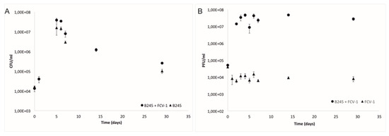 (A) Mean and standard deviation of colony forming units per mL (CFU/mL) of three replicates of Flavobacterium columnare strain B245 during the four-week experiment with phage FCV-1 and without phage. (B) Mean and standard deviation of plaque forming units per ml (PFU/mL) of phage FCV-1, with B245 and FCV-1 without bacteria.