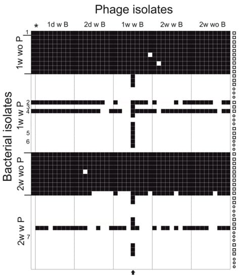 Evolved phage plaque isolates (from four time points; one and two days and one and two weeks from PB and two weeks from B) were tested against bacterial isolates from PB and B from one week and two weeks, three isolates per replicate from B, and six isolates per replicate from PB, resulting in 45 phage isolates against 55 bacterial isolates (including ancestral phage and bacteria). One milliliter of o/n grown bacteria was added to 9 mL of soft agar and plated on top of an agar plate. Plaque lysates were spotted on the bacterial lawn as such and in ten- and hundred-fold dilutions for the detection of individual plaques. On the selected strains, phage infectivity was measured by mixing 100 μL of ten-fold dilutions of phage lysate with 300 μL of o/n grown bacteria in 3 mL of soft agar and poured on an agar plate.