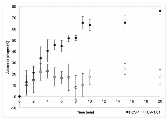 The mean and stdev of a typical adsorption as percentage (%) of adsorbed phage in time (minutes) of the original FCV-1 compared to the evolved FCV-1.01. Experiment was performed in triplicates.