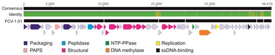 Genome alignment of the ancestral FCV-1 (accession number KY979235.1) and the adapted phage FCV-1.01 (accession number MT431535) displaying the genome consensus and FCV-1.01 with predicted open reading frames (ORFs) as arrows. Identity is displayed as green (100% identity) and yellow (the locations of differences between the two genomes). Breaks in the FCV-1.01 bases indicate the locations of deletions compared to FCV-1. Putative functions are shown in colors indicated in the bottom and the light blue arrows indicate the hypothetical proteins. PAPS stands for phosphoadenosine phosphosulfate sulfurtransferase, NTP-PPase for nucleoside-triphosphatase.