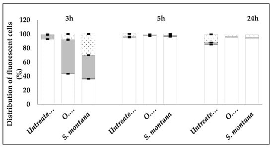 Membrane integrity of S. aureus ATCC 25923 after 3, 5, and 24 h exposure to Satureja montana and Origanum majorana decoctions at 1.56 mg/mL. White bars with dots represent cell fragments or unstained cells; white bars represent cells with intact cell membranes; Gray bars represent cells with slight cell membrane permeabilization; Black bars represent cells with (complete) cell membrane permeabilization. The means ± standard deviations for three independent assays are presented.