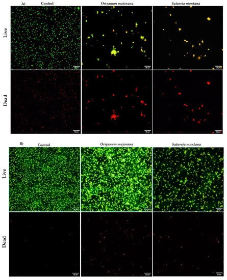 Live/dead cell viability images of S. aureus following 3 h (A) and 24 h (B) exposure to 0 (control—untreated cells) and 1.56 mg/mL of Origanum majorana and Satureja montana decoctions. Live cells were stained with green and dead cells were stained with red. Magnification 400×. Scale bar = 20 µm.