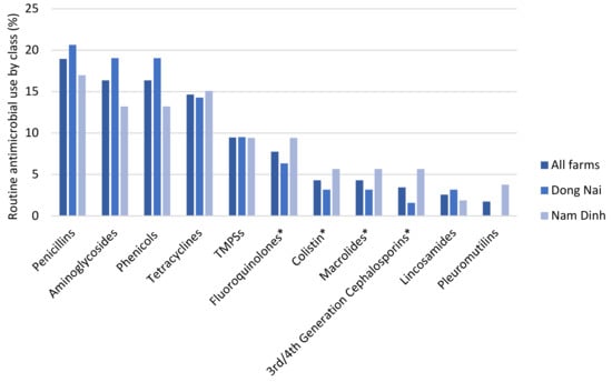 Routine antimicrobial use by antimicrobial class (%) (n = 116). In the case of a combination antimicrobial product, each active ingredient is recorded separately. * = Antimicrobials identified by the WHO as HP-CIAs; TMPSs—Trimethoprim sulfonamides.