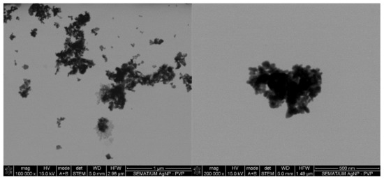Silver nanoparticles (AgNPs) colloidal dispersion scanning transmission electron microscopy (STEM) micrographs at magnifications of ×100,000 and ×200,000 with evidence of formation of NPs clusters.