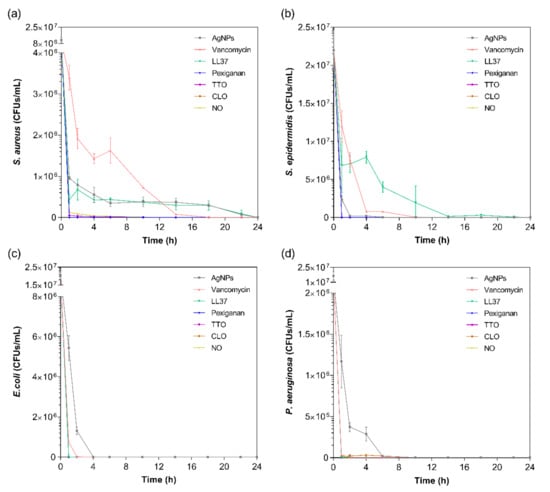 Kill-time curves of AgNPs, vancomycin, LL37, pexiganan, TTO, CLO and NO, at the MICs concentrations, against (a) S. aureus, (b) S. epidermidis, (c) E. coli and (d) P. aeruginosa, up to 24 h culture. Data derived from three repetitions. Positive controls for each bacterium (growth without agent) were also conducted, reaching maximum values of ≈8.0 × 108 colony forming units (CFUs)/mL for S. aureus, ≈1.6 × 109 CFUs/mL for S. epidermidis, ≈1.4 × 109 CFUs/mL for E. coli and ≈8.7 × 108 CFUs/mL for P. aeruginosa after 24 h culture (data not shown).