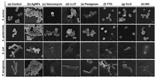 Possible mechanisms of membrane interaction and disruption of the tested bacteria have been observed via SEM imaging through exposition to the selected agents at half of the MICs concentrations, for 24 h. Figure 3 shows the morphology of the bacteria with and without contact with AgNPs, vancomycin and selected AMPs and EOs. As expected, the control (without agent) of the S. aureus and S. epidermidis bacteria revealed a coccoid-shaped conformation with a smooth and uninterrupted surface. Both cell types tended to be arranged in grape-like clusters and cell propagation was recurrently observed [64,65]. The morphology of the E. coli and P. aeruginosa bacteria was also very similar, with both displaying a rod-shaped architecture. E. coli cells are typically 2.0 μm long and 0.25–1.0 μm in diameter. P. aeruginosa cells present similar dimensions and, in many cases, polar flagella, which endows the bacteria with motility, may also be evident [66,67,68]. Here, however, that was not the case. Gram-negative control cells presented an even distribution, displaying multiple cells undergoing polar binary fission.
