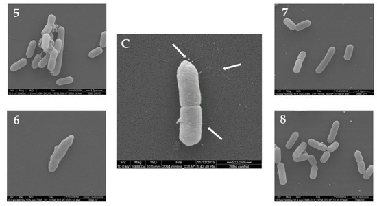Morphology of L. monocytogenes F2365 cells treated with the plant extracts No. (5–8) (group B) observed using SEM, in comparison with L. monocytogenes F2365 that was not treated with samples—control (C). White arrows show flagella in (C).