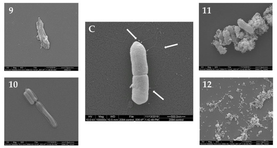 Morphology of L. monocytogenes F2365 cells treated with the plant extracts No. (9–12) (group C) observed using SEM, in comparison with L. monocytogenes F2365 that was not treated with samples—control (C). White arrows show flagella in (C).
