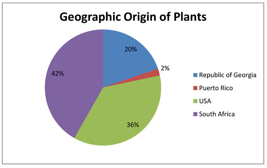 The plant extracts tested in this study were supplied and identified by the Natural Products Discovery Institute, Baruch S. Blumberg Institute, Doylestown, Pennsylvania, USA. The extracts were prepared from specimens of n = 780 plant species representing n = 326 plant species from the Republic of South Africa, n = 285 from the US, n = 154 plant species from the Republic of Georgia, and n = 15 from Puerto Rico (Figure 5).