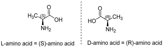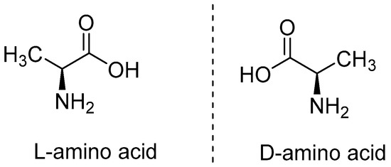 - Jakubowski, H. Amino Acid Stereochemistry—Biology LibreTexts. Available online: https://bio.libretexts.org/Bookshelves/Biochemistry/Book:_Biochemistry_Online_(Jakubowski)/02:_PROTEIN_STRUCTURE/2A:_Amino_Acids/A02._Amino_Acid_Stereochemistry (accessed on 23 April 2020).