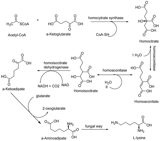 - Fazius, F.; Shelest, E.; Gebhardt, P.; Brock, M. The fungal α-aminoadipate pathway for lysine biosynthesis requires two enzymes of the aconitase family for the isomerization of homocitrate to homoisocitrate. Mol. Microbiol. 2012, 86, 1508–1530. [Google Scholar] [CrossRef]