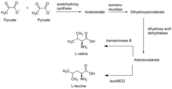 - Amorim Franco, T.M.; Blanchard, J.S. Bacterial branched-chain amino acid biosynthesis: Structures, mechanisms, and drugability. Biochemistry 2017, 56, 5849–5865. [Google Scholar] [CrossRef] [PubMed]