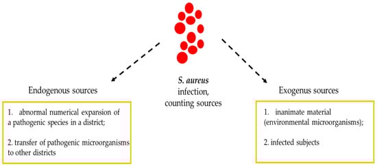Athletes who have contracted skin infections caused by SA are more likely to have a recurrence if the fomites were contaminated with SA. The ease with which MRSA spreads among athletes is due to the different conditions faced during training and competitions. In fact, athletes can exhibit repeated skin-to-skin contact; abrasions of skin tissues that, if left uncovered, can facilitate the spread of MRSA; the sharing of spaces; a lack of hygiene, such as a lack of washing hands or taking a shower after training or post-race; and the sharing of tools and toilets [1,3,20,21,22,23]. It is true that the pathogenic microorganism is commonly spread through droplets transported from the area (aerosol), but direct contact with nasal secretions or fomites (contaminated objects) plays a fundamental role in the rapid spread of the infection. However, in some cases, it is possible that the strain responsible for the appearance and propagation of SA-induced disturbances was acquired from a non-nasal endogenous source or environmental sources (Figure 2).