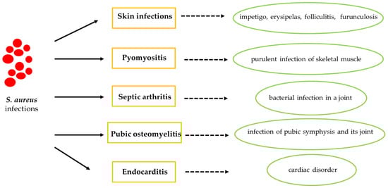 SA can cause numerous disorders, such as skin infections, pyomyositis, septic arthritis, pubic osteomyelitis and endocarditis (Figure 3). The long-term nasal transport of SA is a known risk factor for the spread of skin infection in sports including physical contact [20]. However, SA can spread among athletes not only by the presence of skin infections, but also thanks to its ability to survive in the common areas of a sports facility [21,24]. In fact, SA resides in the anterior nostrils of individuals, the main reservoir for the pathogen, predisposing athletes to subsequent infections. In contrast, SA infections account for 30% of endocarditis cases in hospitalized non-athletic patients [32,33].