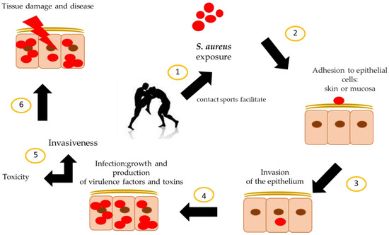 The cutaneous tissue represents the largest organ of the human body [34]. Therefore, in contact sports, there is an increased risk of contracting SA infections (Figure 4) [35,36,37]. In fact, it has emerged that skin-to-skin contact represents a central cause of transmission of SA among athletes [1]. Many studies have highlighted how the surface of dry, salty, low pH skin prevents the correct growth of SA [38]. However, an athlete’s skin, soaked in sweat, provides a microenvironment suitable for SA growth. Therefore, the release of sweat from the skin and the consequent contact between athletes are the key points of the transmission of infections caused by SA in contact sports such as football, basketball and rugby [39]. In addition, the nasal transport of SA has a strong ability to colonize skin tissue [40]. Furthermore, it has been shown that the sweat glands, the sebaceous glands and the hair follicles have a single microbiota [41]; in this case, the sebaceous glands secrete the lipid-rich sebum, and with this hydrophobic coating, they are able to protect and lubricate the hair and skin, acting as an antibacterial coating generating a molecular defense mechanism [42]. However, the relationship between exercise-induced sweating and the transmission of SA in sports by physical contact between athletes remains unclear. In this scenario, two factors may be involved in the transmission of SA in an athletic environment. First, nasal carriers also carry the pathogen on their hands. Therefore, not only are contaminated hands considered to be a likely source of transmission, but hands, in many cases, act as vectors for the transmission of nasal SA. Secondly, SA can also live on the skin, which means that it can easily spread from one person to another through sweat and subsequent contact. The latter hypothesis is considered the dominant mode of transmission. SA is more present on the skin surface due to the sweat produced during exercise in nasal carriers [28]. Although SA is found on the skin, the nose appears to be the main reservoir for its replication and transmission to other sites in the body. In fact, in the case of SA infection, the use of a topical intranasal antibiotic is suggested, which will have the task of temporarily blocking the transfer of SA from the nose to other colonization sites [43]. This is because, in most cases, nasal SA isolates are often identical to the strains that subsequently cause clinical infections [44,45]. These infections show an endogenous origin [46,47]. This knowledge allows us to affirm that direct physical contact with biological fluids is one of the main sources of the diffusion of SA [48]. Suzuki and Tagami [28] examined the SA of the skin surface before and after exercise, showing that the density of the nasal SA was related to that of the SA of the skin surface. This study indicates that sweat during exercise promotes the appearance of SA in nasal carriers. Recently, direct evidence of the existence of SA on the surface of the skin has been reported in healthy adult males after participating in high-intensity resistance exercises [49]. As a result, sweat during exercise seems to play a crucial role in the appearance and transmission of the infection. Therefore, the chances of players on the team passing SA to other team member increases during training and matches.