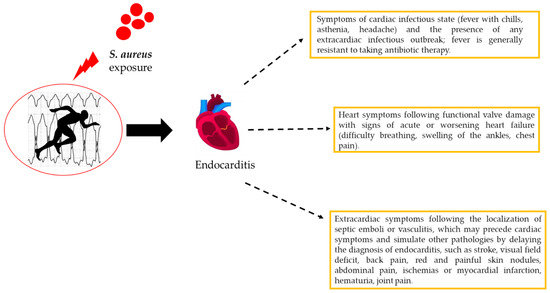 Infective endocarditis (IE) is one of the most serious complications of SA infection, including methicillin-resistant SA (MRSA) [66,67,68]. In addition, those with unknown genetic cardiac disorders have a high risk of endocarditis [69,70,71,72]. Infective endocarditis is uncommon in healthy patients, but this complication can also occur in athletes (Figure 5). IE is a cardiac disorder caused by pathogenic microorganisms invading the endocardial surface, which affects intracardiac structures in contact with the blood, including large intrathoracic vessels and intracardiac devices. The epidemiology of SA endocarditis has changed in the past few decades, and this bacterium has become the leading cause of infective endocarditis in many areas of the world [73] as cases of MRSA infection have increased. SA represents the main cause of the pathogenic microorganism that causes IE in developed countries [66,74].