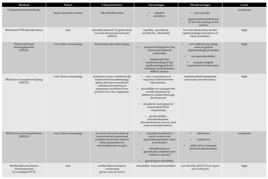The POT methods have been applied to study nosocomial epidemics of MRSA, showing a high discriminatory power [86,87]. Although strategies using molecular genotyping have been able to successfully detect the presence of SA infection, they are expensive compared to standard culture methods [82,83,84,85,86,87,88,89,90,91,92]. In this scenario, the development of a reliable laboratory method that can be readily adopted by general diagnostics laboratories to improve and accelerate the capacity of these tests is increasingly needed.