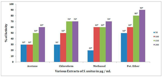 Among the various tested extracts, petroleum ether, acetone, chloroform, and methanol extracts of S. unitus showed the presence of all the studied metabolites (28/32) except alkaloids (Table 1).