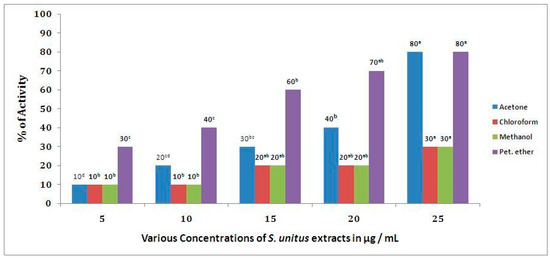 Total phenolic, tannins, steroids, flavonoids, and terpenoids obtained from the various extracts of S. unitus are are shown in Table 2. The total phenolic contents of S. unitus were as follows: methanol (300 ± 10 mg GAE/g DW) > chloroform (90 ± 20 mg GAE/g DW) > petroleum ether (60 ± 20 mg GAE/g DW) > acetone (50 ± 5 mg GAE/g DW). Among the various S. unitus extracts, the methanol extract showed the maximum amount of tannins (50 ± 2 mg RE/g DW), with the least amount from the chloroform extract (10 ± 1 mg RE/g DW). The maximum extractable steroids were observed in chloroform (0.2 ± 0.03 mg/g), followed by acetone (0.2 ± 0.01 mg/g) and petroleum ether (0.1 ± 0.04 mg/g). The methanol extract of S. unitus revealed the lowest level of steroids (0.1 ± 0.01 mg/g). With regards to total extractable flavonoids in S. unitus, it was as follows: methanol > petroleum ether > chloroform > acetone, while an inverse trend was found for extractable terpenoids: chloroform > acetone > petroleum ether > methanol.