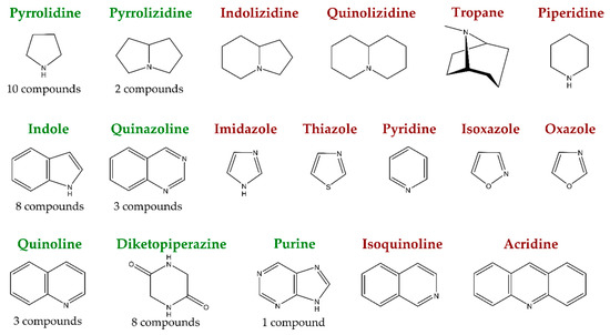 On the left, in green, structural alkaloid groups for which novel compounds with antimicrobial properties are reported since 2015, isolated from marine fungi, alongside with how many compounds in total were found. On the right side, in red, the remaining groups of true alkaloids.