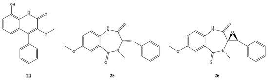 In 2017, Pan et al. [30] discovered a new antimicrobial quinoline derivative, 9-hydroxy-3-methoxyviridicatin (24), alongside its two precursors 7-methoxycyclopeptin (25) and 7-methoxycyclopenin (26). All compounds were found in the hydrovental crab-associated Aspergillus versicolor XZ-4 strain in Taiwan. All three compounds displayed a narrow antibacterial activity, only against the Gram− E. coli, with 25 bearing the most potent antibacterial activity of the three, indicating that the viridicatin skeleton is worth exploring further as an antimicrobial compound. The structure of these compounds is presented in Figure 6.