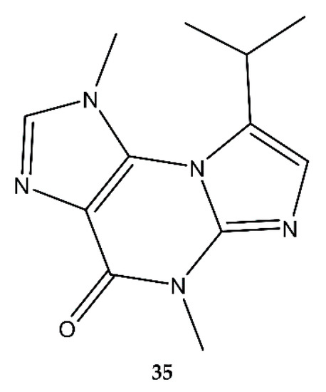 Acremolin B (35) was discovered by Tian et al. (2015) [35] in the deep-sea-derived fungus Aspergillus sp. SCSIO Ind09F01 (Figure 8). No antimicrobial assay was conducted, only a cytoxicological one. Three years later, Li et al. (2018) [36] detected a purine compound in the Antarctic-derived fungus A. sydowii SP-1 and named it acremolin C. It showed weak antibacterial activity exclusively against Gram+ bacteria, such as MRSA, MRSE, S. aureus, and S. epidermidis. No fungicidal activity was detected. In 2019, Banert et al. [37] stated that the compound found by Li et al. (2018) was in fact acremolin B instead of acremolin C, according to their NMR data. This means that acremolin B was found in two different marine fungi and shows antimicrobial activity.