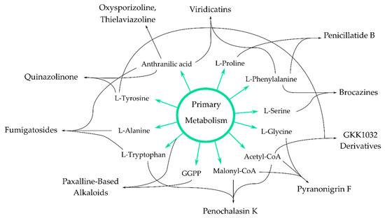 To date, the biochemical synthesis of compounds discussed throughout this review is not fully elucidated. In some cases, plausible biosynthesis pathways are hypothesized based on the structural classification of these alkaloids, while, for others, biosynthesis gene clusters are proposed and, for some, only speculations are reported. Generally, alkaloids are secondary metabolites biosynthesized from amino acids. Their synthesis is intertwined with the primary metabolism through, e.g., the Krebs cycle and shikimic acid pathway [53]. Recent reviews about the biosynthesis of heterocycles [54], fungal indole alkaloids [55], diterpenoid indole alkaloids [56], and epidithiodioxopiperazines [57] were published. This review identifies the knowledge gaps in the biochemical synthesis routes of newly discovered antimicrobial alkaloids discussed in Section 2 and addresses chemical production strategies if known. The proposed biochemical origin of these novel alkaloids is given in Figure 9, with their biosynthesis gene clusters and those of some closely related compounds in Figure S1 (Supplementary Materials).