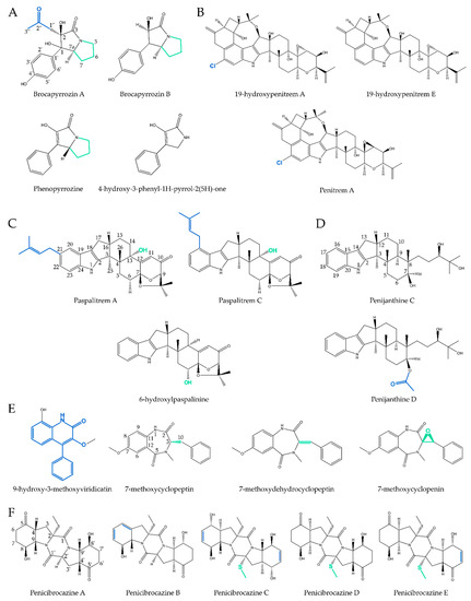 Structure–activity analysis of newly discovered antimicrobial alkaloids discussed in this review. (A) Structural comparison of brocapyrrozin A and B, phenopyrrozin, and 4-hydroxy-3-phenyl-1H-pyrrol-2(5H)-one. The acetonitrile group on C-2 (blue) and the absence of the pyrrole group (green) probably increase the fungicidal activity. (B) Structural comparison of penitrem A and its derivatives, 19-hydroxypenitrem A and 19-hydroxypenitrem E. The presence of a chlorine atom (blue) most likely elevates antibacterial activity. (C) Structural comparison of paspalitrem A, paspalitrem C, and 6-hydroxylpaspalinine. The differences between the structures are highlighted in blue and green. (D) Structural overview of penijanthines C and D. The acetoxy group at C-7 (blue) of penijanthine D probably lowers anti-Vibrio activity. (E) Structural overview of 9-hydroxy-3-methoxyviridicatin and the cyclopeptin derivatives. The viridicatin (blue) structure is proven to be a promising antibacterial compound core, worth looking further into, while the cyclopeptin antimicrobial activity could be dependent on the chirality of its C-3 atom (green). (F) Structural comparison of penicibrocazines A–E. The lack of double bonds (blue) and/or S-methyl group at C-2′ (green) might explain the absence of antimicrobial activity of penicibrocazine A compared to penicibrocazines B–E.