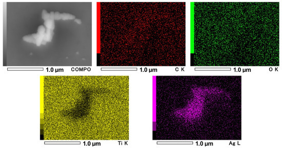 Energy-dispersive X-ray spectroscopy (EDS) mapping images of nano-Ag coating. COMPO: reflection electron composition image; C: carbon; O: oxygen; Ti: titanium; Ag: silver. The aggregation of the nano-sized particle and the composition was Ag.