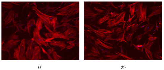 Fluorescent images after 24 h incubation: (a) control; (b) nano-Ag coating. The morphology of actin filaments (red) and nuclei (blue) indicate no difference between control and nano-Ag coating.