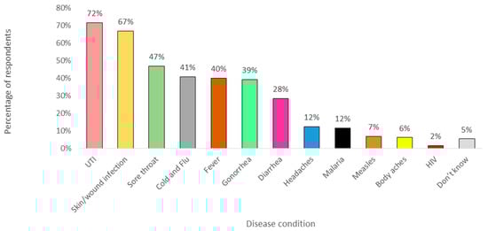 Percentages of the respondents who identified appropriate use of antibiotics in the various disease conditions. HIV: human immunodeficiency virus, UTI: urinary tract infection.