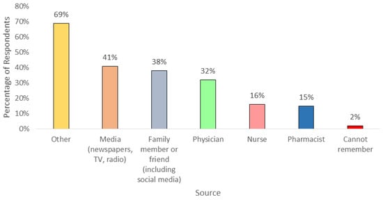 When asked about the terminology, the students recognized the terms related to antibiotic resistance (89%, n = 116), drug resistance (78%, n = 102), antibiotic-resistant bacteria (72%, n = 94), and antimicrobial resistance (52%, n = 67). However, the acronym AMR (25%, n = 33) which stands for “antimicrobial resistance” and superbugs (25%, n = 33) were not well-known among the students. The most common source of the terminology was media (41%, n = 53), followed by a family member or friend, including social media (38%, n = 49), physician (32%, n = 41), nurse (16%, n = 21), pharmacist (15%, n = 19); other sources include pre-university and university lectures and secondary schools (69%, n = 90) (Figure 2).