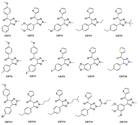 The molecular structures of 1,3,4-trisubstituted-1,2,3-triazole analogues (GKV1–15) studied for antifungal properties against Candida parapsilosis, Candida albicans, Candida tropicalis, Aspergillus niger, and Trichophyton rubrum by a 3-[4,5-dimethylthiazol-2-yl]-2,5-diphenyltetrazolium bromide (MTT) microdilution assay.