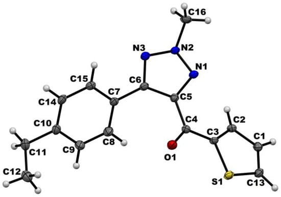 Single-crystal data were collected on a Bruker APEX II diffractometer equipped with a CCD detector, using monochromated Mo Kα radiation (λ = 0.71073 Å). Unit cell measurement, data collection, integration, scaling, and absorption corrections for the crystal were carried out using the Bruker Apex II software [38]. Data reductions were performed with the Bruker SAINT suite [39]. The crystal structures were solved by direct methods using SIR 92 [40] and refined by the full-matrix least-squares method using SHELXL 2014 [41], which is included in the program suite WinGX (version 2014.1) [42]. Absorption corrections were applied using SADABS [43]. All non-hydrogen atoms were refined anisotropically, and all hydrogen atoms were positioned geometrically and refined using a riding model with Uiso(H) = 1.2Ueq. The Oak Ridge Thermal Ellipsoid Plot (ORTEP) and crystal packing diagrams were generated using the Mercury 3.5.1 (CCDC) program [44]. Geometrical calculations were performed using PARST [45] and PLATON [46]. The single-crystal data collection and refinement details are tabulated in Table 3. Intermolecular interactions involved in the title compound (5-(4-ethylphenyl)-2-methyl-2H-1,2,3-triazol-4-yl)(thiophen-2-yl)methanone (GKV10) are summarised in Table 4. Crystal information file (CIF) of compound GKV10 was deposited in The Cambridge Crystallographic Data Centre (CCDC) [47] with CCDC number 1443666 and available as electronic Supplementary Material.