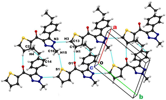 Packing network of molecules down the ab plane associated with C-H···N, C-H···O hydrogen bonds and C-H···S and C-H···π intermolecular contacts.