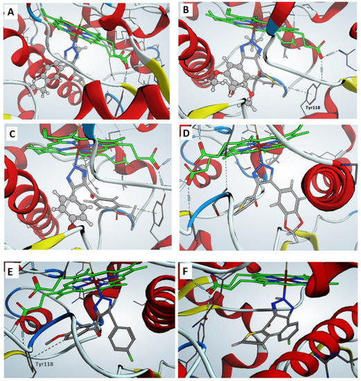 The Molecular Operating Environment (MOE) program was used for performing the docking studies. The chain A was selected as the main chain, which was complexed with heme–porphyrin and a reported azole inhibitor. The amino acids within a radius of 6.5 Å were selected in the binding site. The triangle method was the main placement method. London dG was used as a rescoring method. The Merck molecular force field 94x (MMFF94x) was selected as a force field [49].