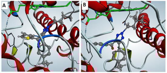 (A) Docking pose of compound GKV12. (B) Docking pose of compound GKV14.