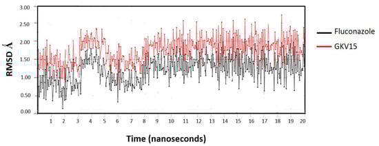 The top-ranked compound, GKV15, with a high docking score and the best biological result was subjected to a molecular dynamics study against the standard antifungal agent, fluconazole, over 20 nanoseconds (ns) to evaluate the strength of their binding. The oscillations of the tested compound started with RMSD 1.5 Ǻ during the first 3 ns. Then, from 3 ns to 8 ns, there were oscillations suspended between 1.25 Ǻ and 2.00 Ǻ. Equilibrium was reached at 2.00 Ǻ at exactly 8 ns, which was then maintained (Figure 8). Interestingly, these oscillations were parallel to those of fluconazole, but the latter showed lower RMSD values as it reached its equilibrium at 1.5 Ǻ.