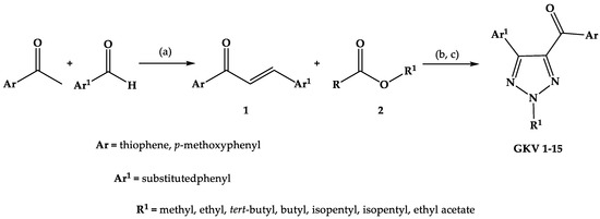 Synthesis of the title compounds GKV1–15. Reagents and conditions: (a) 6N NaOH, Ethanol, 5 h, r.t; (b) NaN3, ZrO2-Cu2-β-CD, DMF, 100 °C, stirred, 15 h; (c) 100 °C, stirred, 16 h.