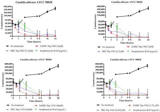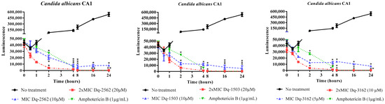 This assay was carried out with combinations of the four peptides individually and amphotericin B against strain C. albicans ATCC 90028, and with the pilosulin- (Dq-2562 and Dq-1503) and ponericin-like (Dq-3162) peptides against the amphotericin B- and fluconazole-resistant C. albicans CA1. Aliquots of 50 µL of peptides and 50 µL of the antifungal drug were mixed in microtubes, at their subinhibitory concentrations that showed the best results in the checkerboard assay. Afterward, 100 µL of microbial inoculum (0.5 McFarland standard, 106 CFU/mL) were transferred and mixed The mixtures were incubated at 35 °C and, in a time-frame of 0.0, 0.5, 1, 2, 4, 8, 16, and 24 h of incubation, 50 µL aliquots were removed and transferred to individual wells in a 96-well flat bottom black microplates. Subsequently, 50 µL of the BacTiter-Glo® reagent (Promega, Madison, WI, USA) was added to each well and the plates were incubated for 5 min, in the dark, under gentle agitation. Luminescence was measured with the Synergy HT multiple detection microplate reader (BioTek, Winoski, VT, USA). Untreated microbial suspensions and treated only with peptides or only with the reference antifungal (amphotericin B) were used as controls. Wells containing only Sabouraud broth were used to obtain the background values of luminescence. The test was performed in triplicate
