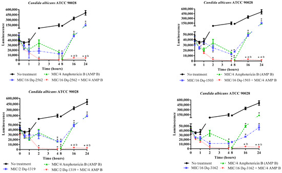 Time-kill effect of D. quadriceps antimicrobial peptides in combination with amphotericin B on the cell viability of Candida albicans CA1. ANOVA and Tukey’s multiple comparisons test. * p < 0.05 (compared to no treatment). a p < 0.05 (compared to subinhibitory concentration of individual peptides alone). b p < 0.05 (compared to subinhibitory concentration of amphotericin B, AMP B).