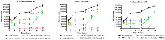 In Figure 3, the time-kill curves show the antifungal activity of the synthetic peptides in combination with amphotericin B against C. albicans ATCC 90028, at their subinhibitory concentrations. As can be seen, the four individual peptides in combination with amphotericin B are able to reduce the microbial viability within 8 h of exposure, even at concentrations that are 16-fold (for Dq-3162, Dq-2562, and Dq-1503) and 2-fold (for Dq-1319) lower than the MICs for the peptides alone. As noticed in Figure 4, after 4 h (for Dq-2562 and Dq-1503) or 8 h (for Dq-3162), at sub-MIC concentrations, the activity of peptides that were not associated with amphotericin B against C. albicans CA1, was still fungistatic. The fungistatic effect is also observed with amphotericin B at sub-MIC concentrations within the same time-frame.
