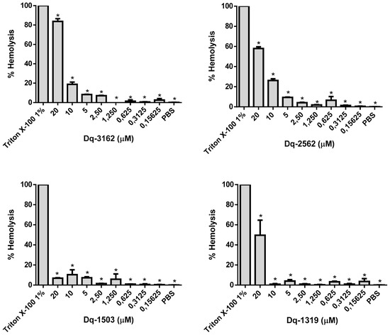 Percentage of hemolysis, in vitro, after exposure of human erythrocytes to synthetic pilosulin- (Dq-2562, Dq-1503, and Dq-1319) and ponericin-like (Dq-3162) peptides. Human red blood cells were treated with serial concentrations of these D. quadriceps antimicrobial peptides for 1 h, as described in materials and methods. ANOVA and Dunnett’s multiple comparisons test. * p < 0.05 (compared to 1% Triton X-100).
