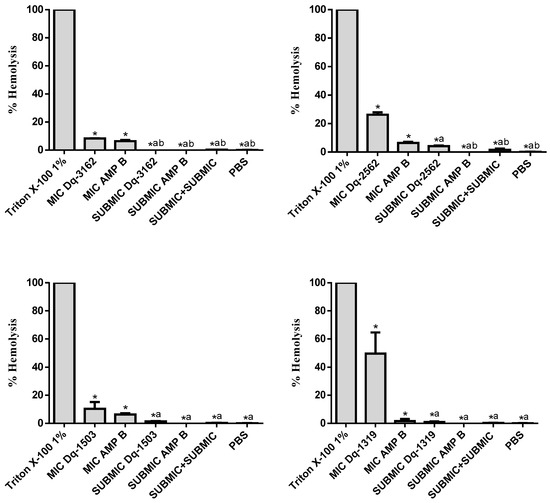 In Figure 6, the percentage of hemolysis is shown for (1) the individual peptides and amphotericin B at their MIC-equivalent concentrations for the drug-resistant clinical strain C. albicans CA1 (for Dq-3162, Dq-2562, and Dq-1503) and for the standard strain C. albicans ATCC 90028 (for Dq-1319); and (2) for the combinations of individual peptides and amphotericin B, at their subinhibitory MICs (SUBMIC), which are equivalent to those concentrations that synergistic effects were observed for the same strains used in the checkerboard test. As can be seen, the combinations of the individual peptides and amphotericin B, at their subinhibitory concentrations (sub-MICs), in which that peptide and antimycotic drug together are synergistically fungicide, hemolysis activity was negligible, in vitro.
