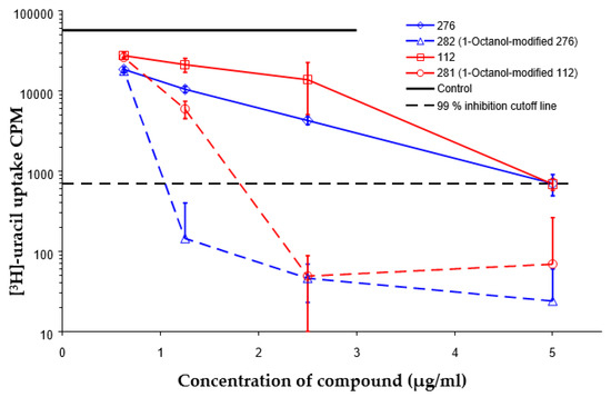 Inhibition of 3[H]-uracil uptake by intracellular mycobacteria. Results are expressed as medium counts per minute (CPM ± SD) for triplets. Solid black line (control): the level of [3H]-uracil uptake in the absence of compounds. Dashed line: the level of 99% inhibition compared to control samples.