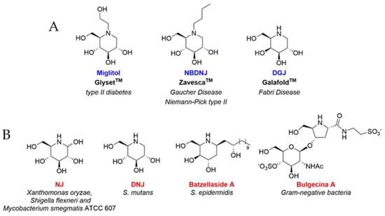 Iminosugars are natural or synthetic sugar analogues having an amino function in place of the endocyclic oxygen of the corresponding carbohydrate []. Due to their excellent ability to inhibit and/or enhance the catalytic properties of ubiquitous carbohydrate processing enzymes, such as glycosidases and glycosyltransferases, iminosugars represent the most promising class of glycomimetics, exhibiting broad-spectrum therapeutic potential [,]. Three iminosugar-based drugs (Figure 1A) are currently marketed for treating type II diabetes (Glyset®) and lysosomal storage disorders, including Gaucher and Niemann–Pick diseases type C (Zavesca®, N-butyl- deoxynojirimycin, NBDNJ) and Fabry diseases (Galafold®, deoxygalactonojirimycin, DGJ) [,,]. In addition, a variety of other iminosugars have been proposed as therapeutic candidates against malignancies [], viral infections [,] and other genetic disorders, including cystic fibrosis [,,,]. Conversely, iminosugars have displayed only in a few cases efficacy against bacterial pathogens (Figure 1B). Nojirimycin (NJ) exhibited antibacterial activity against Xanthomonas oryzae, Shigella flexneri and Mycobacterium smegmatis ATCC 607 [], while deoxynojirimicyn (DNJ) was found to inhibit Streptococcus mutans biofilm formation [,,]. Other modified iminosugars such as Batzellaside A and Bulgecin A held interesting properties against Staphylococcus epidermidis and Gram-negative bacteria, respectively []. Eventually, selected piperidine and indolizidine iminosugars were found to inhibit the early biofilm formation of Pseudomonas aeruginosa [].