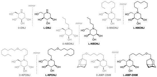 d- and l-deoxyiminosugars studied in this work. DNJ, deoxynojirimycin; NBDNJ, N-butyl DNJ; NNDNJ, N-nonyl DNJ; NPDNJ, N-nonyloxypentyl DNJ; AMP-DNM, N-[5-(adamantan-1-ylmethoxy) pentyl] -1-DNJ.