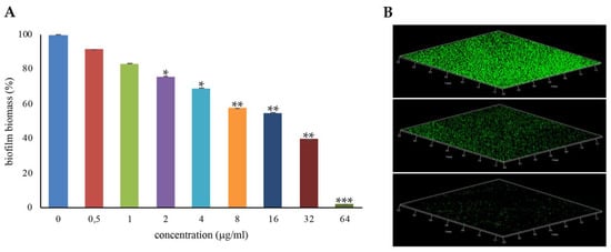 Biofilm formation was examined using a crystal violet (CV) staining assay and confocal laser scanning microscopy (CLSM), according to the previously reported method []. The 0.5 McFarland of bacterial cultures was diluted 1:100 in TSB supplemented with 0.5% glucose. Then, 5 × 106 cells/mL was transferred into a 96-well flat-bottomed polystyrene microtiter plate containing 100 μL of scalar doses of l-NPDNJ (ranging from 64 to 0.5 μg/mL and 64 to 32 μg/mL in CV and CLSM assays, respectively) and incubated at 37 °C for 24 h. Non-treated bacteria were incubated with 100 μL of broth and used as the control. The culture supernatant was gently discarded, the wells were washed twice with phosphate-buffered saline (PBS) 1× pH 7.4 and the biofilms were stained with 200 μL of 0.1% crystal violet for 15 min. The wells were washed twice with PBS 1X, and dye was re-eluted with 100% ethanol. The absorbance was measured at 595 nm using a microplate reader (Bio-Rad Laboratories S.r.l.). All data points are expressed as means ± SDs of three separate experiments performed in triplicate.