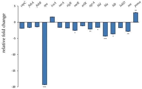 Transcriptional profiling of virulence factor genes in S. aureus ATCC 29213 after treatment with l-NPDNJ determined by qRT-PCR. Data were normalized to rpoB expression. Fold-changes were calculated using treated versus untreated S. aureus cells. Asterisks indicate statistically significant differences between treated and untreated S. aureus cells (* p < 0.05, ** p < 0.01, *** p < 0.001). capC, capsule biosynthesis protein C; fnbA, fibronectin-binding protein A; fnbB, fibronectin-binding protein B; spa, surface protein A; icaA, intercellular adhesion protein A; sarA, staphylococcal accessory regulator A; sigB, RNA polymerase sigma factor B; saeR, response regulator SaeR; arlR, response regulator ArlR; agrA, accessory gene regulator A; hld, delta-hemolysin; hla, alpha-haemolysin; hlb, beta-haemolysin; lukD, pore-forming leucocidin; sea, staphylococcal enterotoxin A; psmα, alpha phenol-soluble modulin.